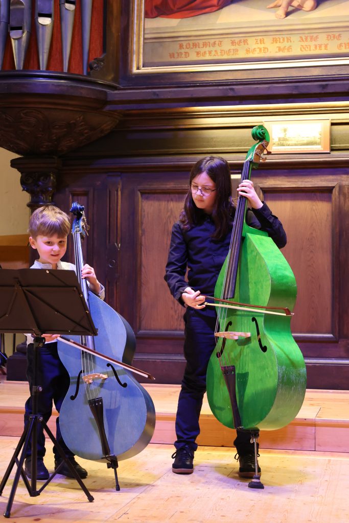 Vater und Sohn – sie waren ein echter Publikumsmagnet: Am 18. April spielte der sechsjährige Peter Szeles (li.) zusammen mit seinem Vater an der Orgel ein Stück für Orgel und Kontrabass. Danach zeigte er sein Können im Kontrabass-Duett mit dem elfjährigen Jakob Schuhmacher (re.). Die beiden jungen Musiker spielten, sozusagen als öffentliche Probe, fünf Stücke für ihre Teilnahme am Musikwettbewerb „Jugend musiziert“ im Februar. Der kleine Peter hat bereits kurz vor seinem sechsten Geburtstag schon einen Regionalwettbewerb von „Jugend musiziert“ mit voller Punktzahl gewonnen. Das Staunen und die Begeisterung des Publikums waren groß, brausender Beifall für die jungen Musiker. So ein Musiker-Arrangement hat die Zollingerhalle noch nicht gesehen!